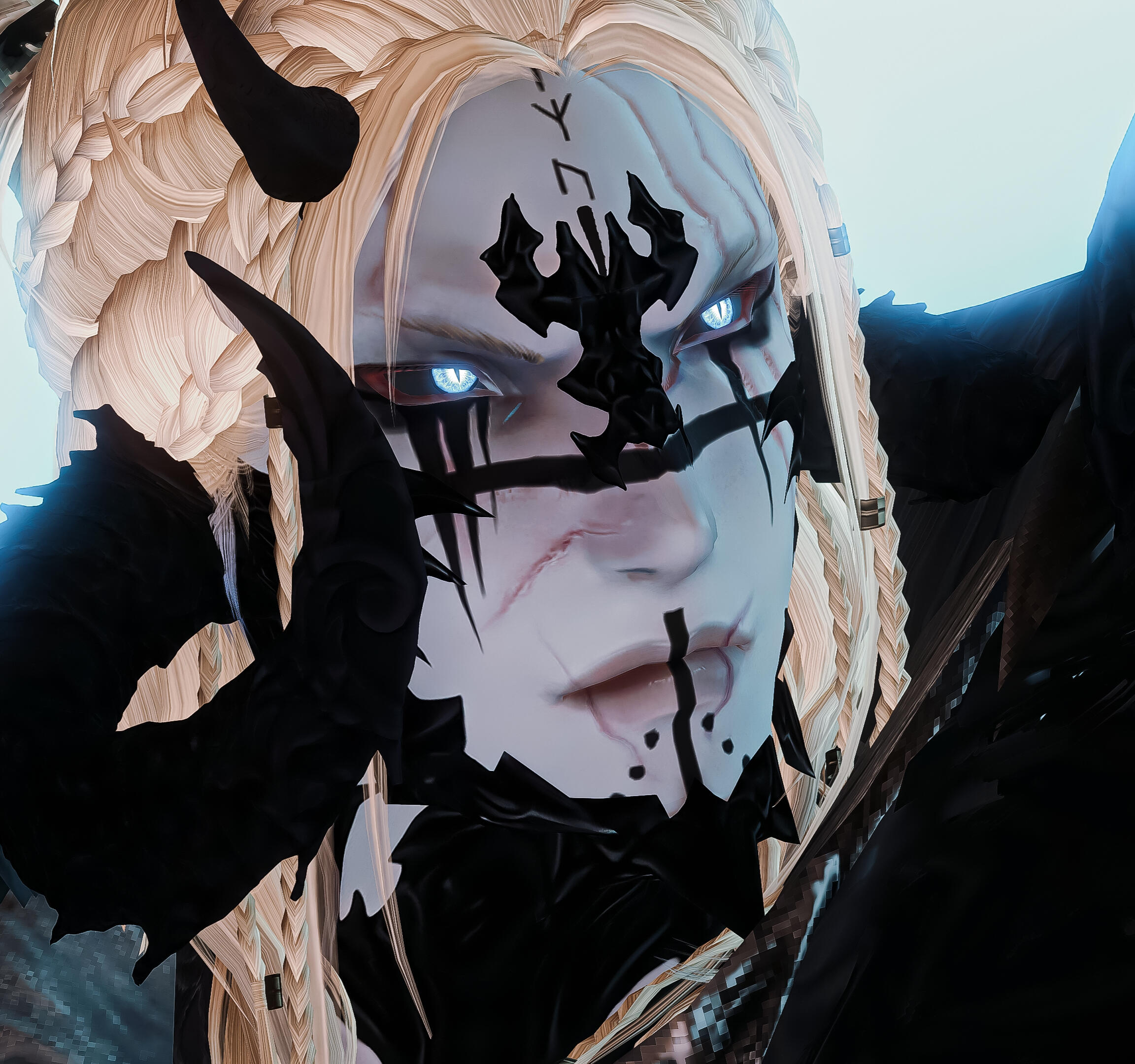 | HAIR: Bleach blond, bit of blue highlights. | SCARS: Right eye and lip. |